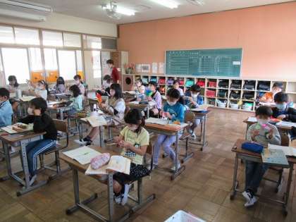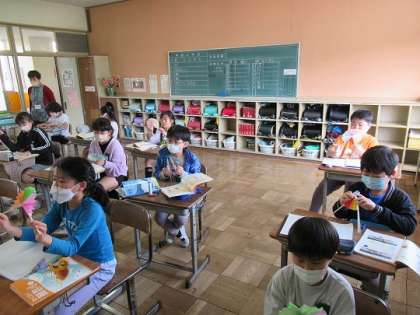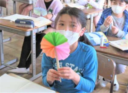 今日は、折り紙と割り箸を使って、まるく開く扇を作っていました。