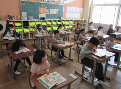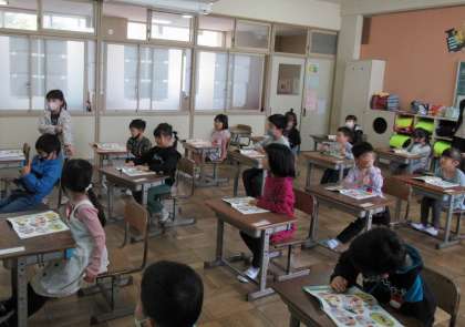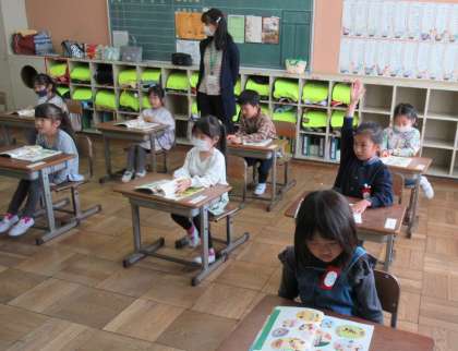 生活場面の絵を見て、どんな声を相手にかけるか考えていました。