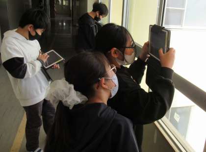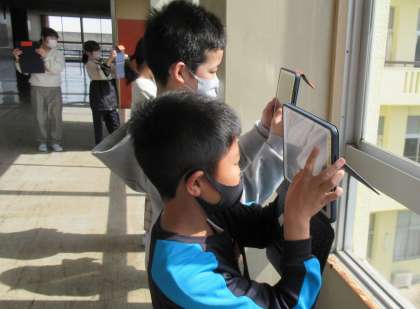 午前と午後の天気の変化をタブレットで写真に撮り、比べていました。