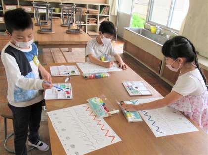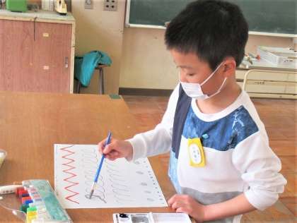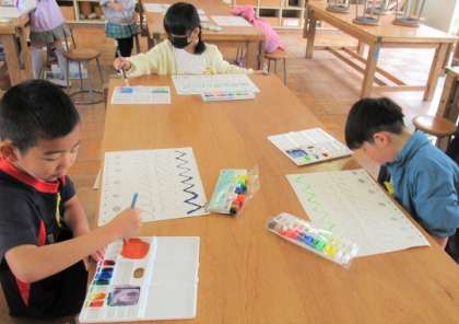 今日は、筆を使って、いろいろな線をかく練習をしていました。