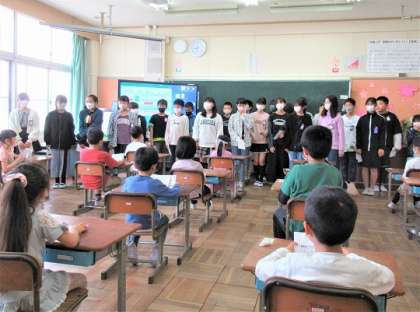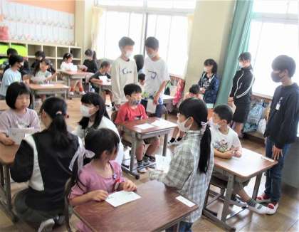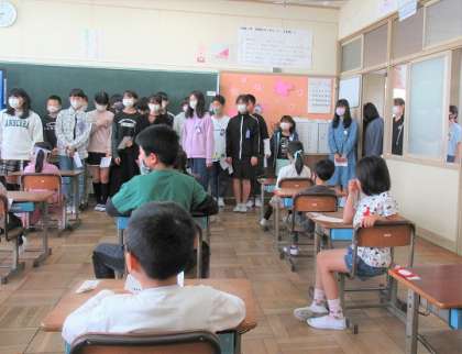 6年生が1年生の教室を訪ね、ペア活動の顔合わせをしていました。