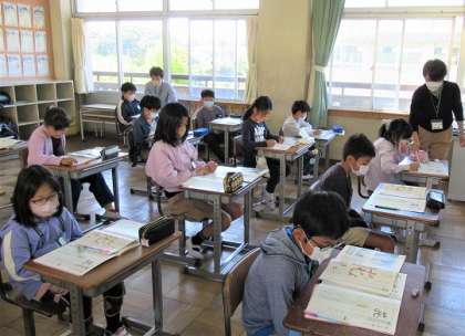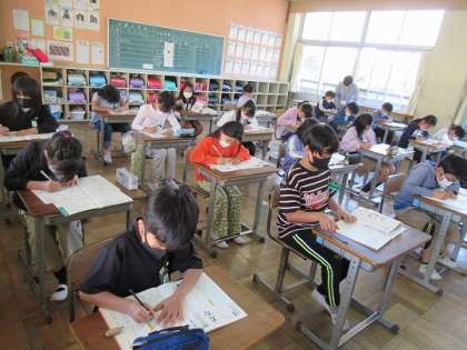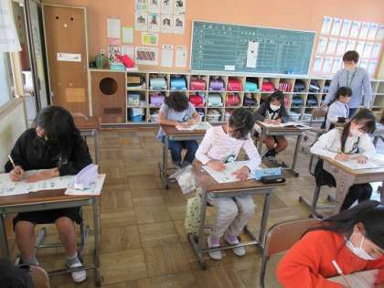 4年生の書写では、点画の筆使いに気をつけて書く学習をしていました。