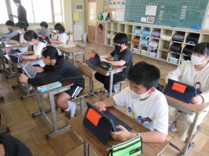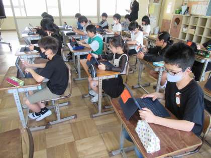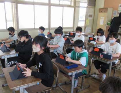 5年生の学級活動では、タブレットを使用した学習をしていました。