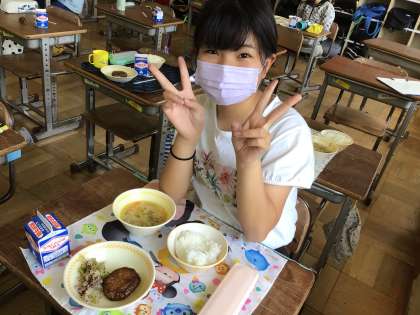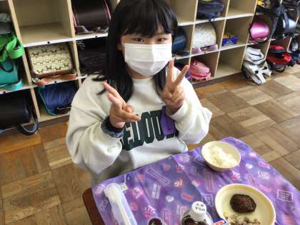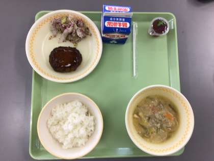 5/17(水) 今日の給食 公開日 2023/05/17 更新日 2023/05/17 旭東+(プラス) 今日のメニューは、ご飯、牛乳、テリヤキハンバーグ、キャベツのゆかり和え、呉汁、一口ぶどうゼリーでした。