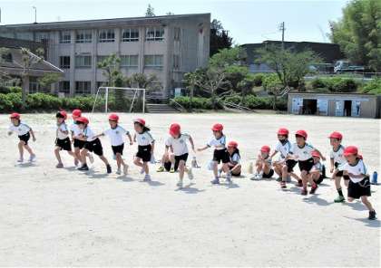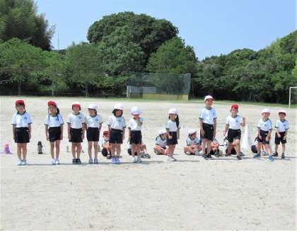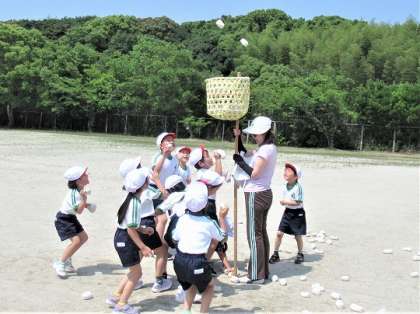 1年生の体育は、2年生と合同授業をしていました。運動会で行う玉入れの練習です。