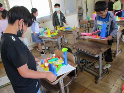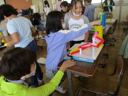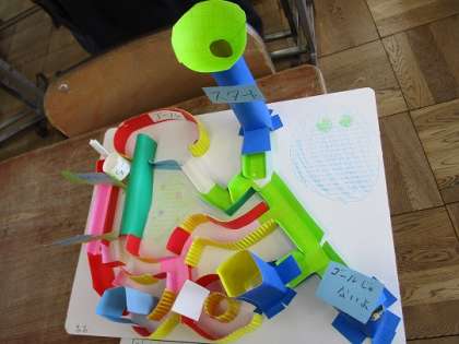 4年生 図工 コロコロコロガーレ 公開日 2023/05/24 更新日 2023/05/24 旭東+(プラス) ビー玉を使って遊ぶ迷路をつくり、 実際に遊んでみたり、鑑賞したりしました。 高低差やカープをうまく使い、 楽しいゲームを作ることができました。