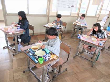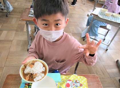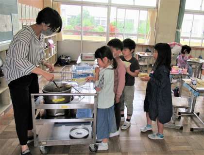 カレーライスは、人気メニューの1つ。おかわりをする児童の列もできていました。