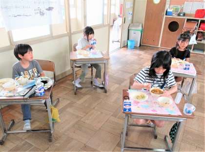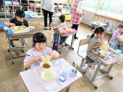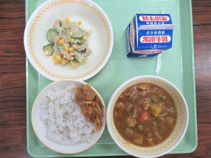 今日のメニューは、麦ご飯、牛乳、カレーライス、かつおフレークのサラダ、福神漬けでした。