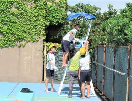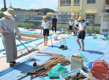 デッキブラシやたわし、ほうきなどを使って、協力しながらみんなで掃除をしました。