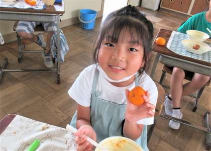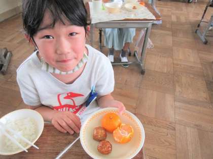 きょうのメニューは、ご飯、牛乳、ごぼう入りつくね2個、高野豆腐の卵とじ、冷凍ミカンでした。
