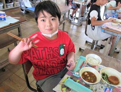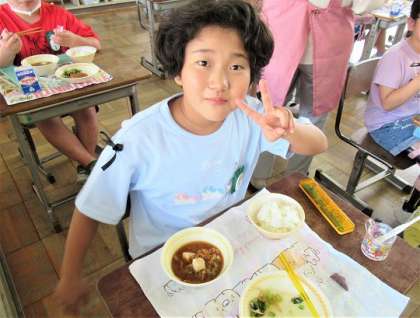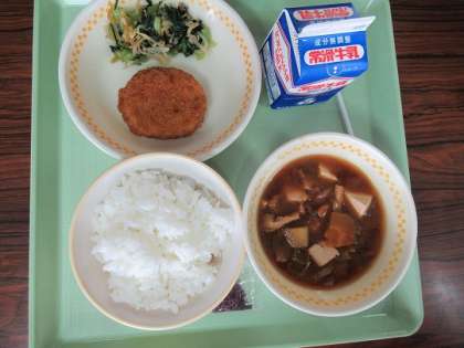 6/19(月) 今日の給食 公開日 2023/06/19 更新日 2023/06/19 旭東+(プラス) 今日のメニューは、ご飯、牛乳、キャベツ入りメンチカツ、小松菜のじゃこ和え、八丁味噌汁、愛知県産赤しそふるかけでした。