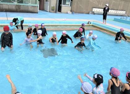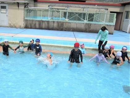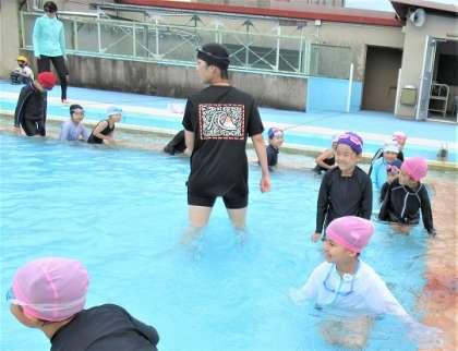 水に入ったら、プールの向かい側にいる児童にタッチをして戻っていました。