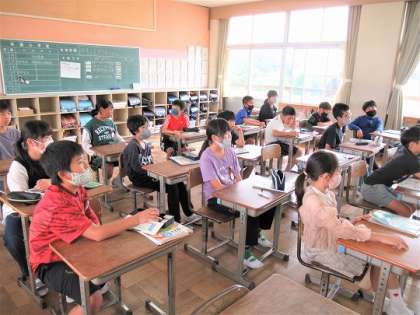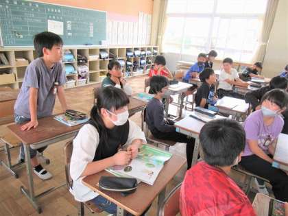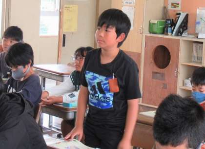 学級で育てているインゲンの成長度合いについて、発表していました。