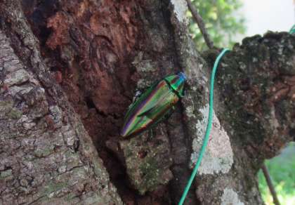昨年の夏休みに続いて、今年も中庭でタマムシを見つけました。タマムシは光を反射させる羽によって、鳥に食べられるのを防いでいるとのこと。羽が鳥よけのCDのような役割をしているようです。