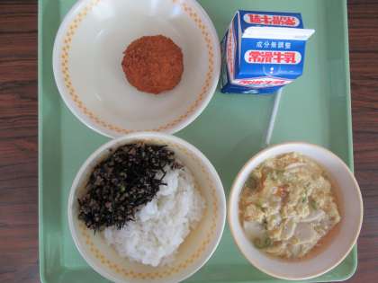 今日のメニューは、ご飯、牛乳、肉ヒジキご飯の具、ナスみそメンチカツ、かきたま汁でした。