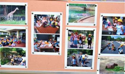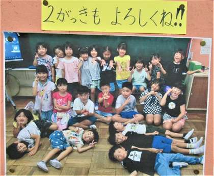1年生廊下には、入学からの思い出が写真で飾られています。2学期に入って、1か月の記録。
