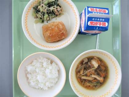 今日のメニューは、ご飯、牛乳、けんちん篠田の甘酢あんかけ、小松菜のごま和え、沢煮椀でした。