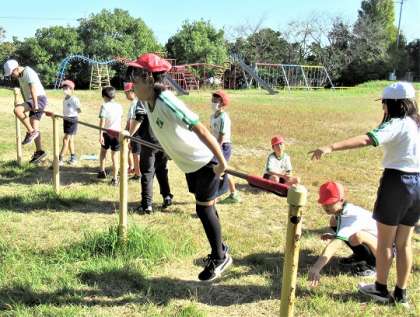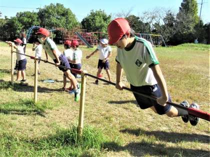 ひざかけ上がり、前方片ひざかけ回転、後方支持回転、前方支持回転を練習しています。
