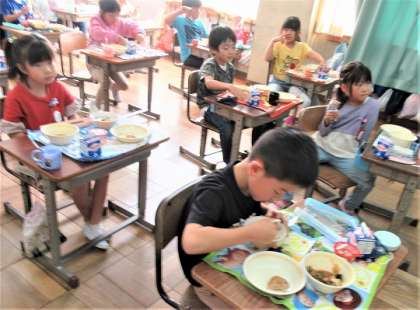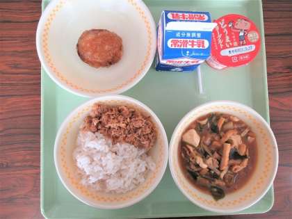 10/19(木) 今日の給食 公開日 2023/10/19 更新日 2023/10/19 旭東+(プラス) 今日のメニューは、麦ご飯、牛乳、海の香りご飯の具、大葉ハンバーグのおろしだれ、エリンギの味噌汁、愛知県産ヨーグルトでした。