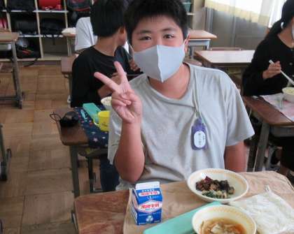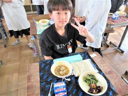 今日のメニューは、ソフトめん、牛乳、きつねかけ汁、大学芋、小松菜ともやしの和え物でした。