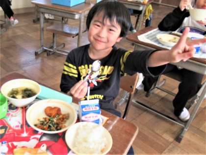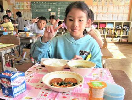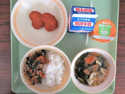 10/23(月) 今日の給食 公開日 2023/10/23 更新日 2023/10/23 旭東+(プラス) 今日のメニューは、ご飯、牛乳、大豆入りナゲット2個、ビビンバ、わかめスープ、野菜ゼリーでした。