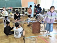 小さな声のとき、大きな声のときのコップに乗せたビーズの震え方を2人ペアで確認していました。