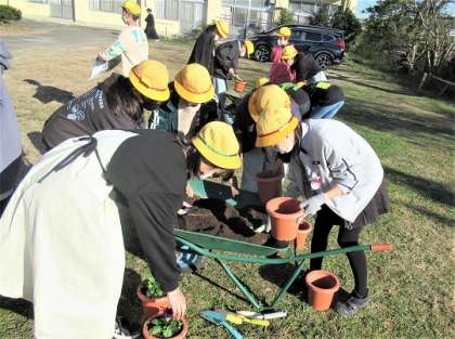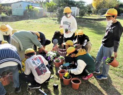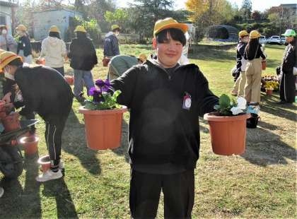 鉢に土をつめ、一人ずつパンジーを植えていました。