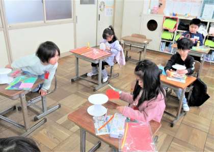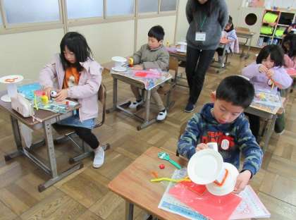 1年生の図工では、「かみざらコロコロ」の作品づくりをしていました。