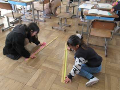 算数 2年生 1mの感覚 公開日 2024/01/26 更新日 2024/01/26 旭東+(プラス) 算数では、生活で生かせるように、 数の感覚や量の感覚をつかませる学習を大切にします。 本日は、1mの感覚をつかみます。 1mと思うところで紙テープを切って、 実際にものさしを使って正しく1mを図ります。 「足りなかった」「長かった」「ほとんどぴったりだった」など、 一喜一憂するかわいらしい子どもたちの声を聴くことができました。