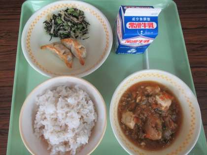 今日のメニューは、麦ご飯、牛乳、焼き餃子2個、麻婆豆腐、春雨とひじきの中華和えでした。