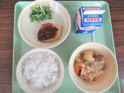 2/20(火) 今日の給食 公開日 2024/02/20 更新日 2024/02/20 旭東+(プラス) 今日のメニューは、ご飯、牛乳、けんちん篠田の味噌だれかけ、ジャガイモのそぼろ煮、たくあんとキュウリの和え物でした。