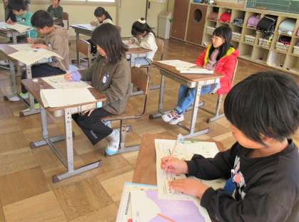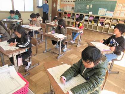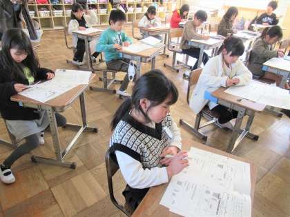 2年生の算数は、分数を中心とした復習プリントで学習していました。