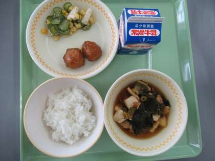 2/27(火) 今日の給食 公開日 2024/02/27 更新日 2024/02/27 旭東+(プラス) 今日のメニューは、ご飯、牛乳、蓮根入りつくね2個、キュウリとイカの酢の物、タマネギの味噌汁でした。