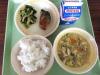 今日のメニューは、ご飯、牛乳、サバの銀紙焼、肉じゃが、キャベツのゆかり和えでした。