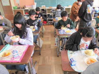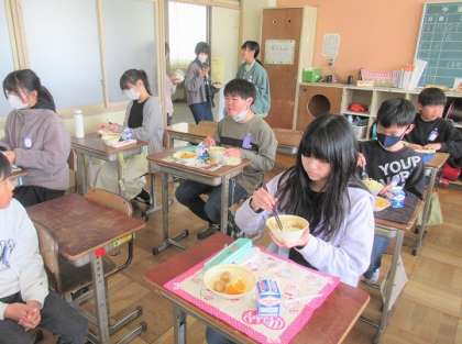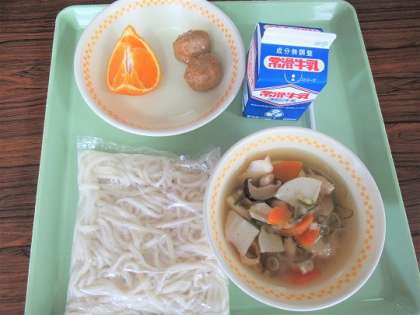 今日のメニューは、ソフトめん、牛乳、和風かけ汁、レバー入りつくね2個、不知火でした。