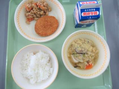 今日のメニューは、ご飯、牛乳、コロッケ、煮豆、かき玉汁でした。