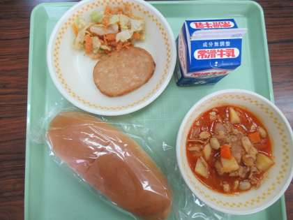 今日のメニューは、ロールパン、牛乳、チキンはムステーキ,ポークビーンズ、にんじんサラダでした。