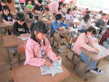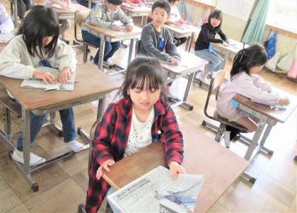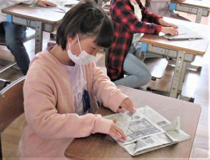 2年生の新聞紙を使ったかぶと作りです。