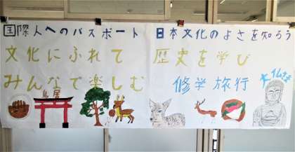 6年生教室廊下に修学旅行のスローガンが掲示されています。16・17日はいよいよ修学旅行です。
