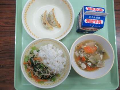 今日のメニューは、麦ご飯、牛乳、ビビンバ、焼き餃子2個、ピリ辛汁でした。