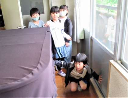 探すチーム、隠れるチームに分かれて歌いながらかくれんぼをしていました。