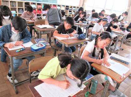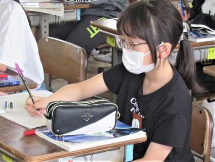 インタビュアー2人が担任に質問しているのを聞き、その魅力をメモしていました。