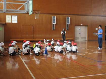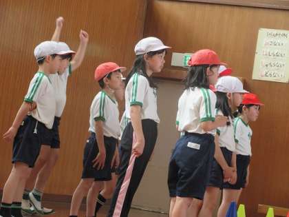 運動場のコンディションが悪いため、体育館での練習です。 ただいま、徒競走の位置確認をしています。