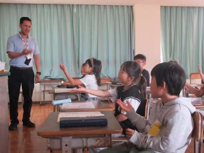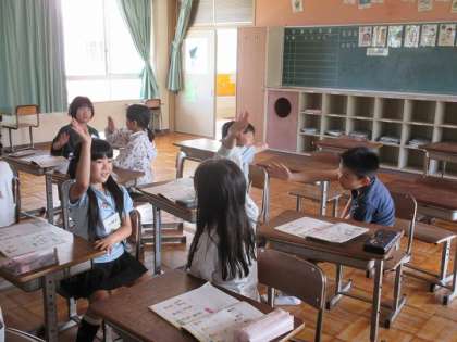 先生と一緒にジェスチャーを使って表現しています。 どの子も、表情豊かです。