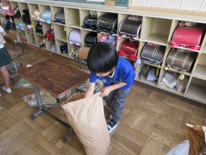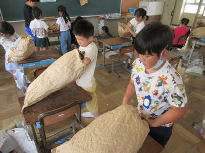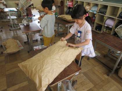 ふくろの中に新聞紙をつめながら・・・。