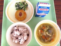 今日のメニューは、ご飯、牛乳、焼き餃子2個、生揚げの中華煮、野菜としらす干しのナムルでした。