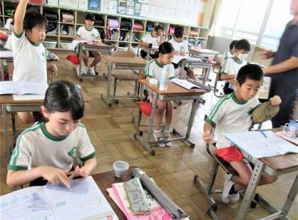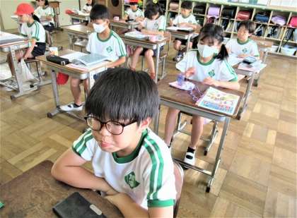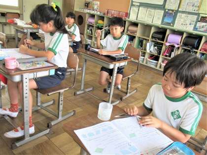 水曜日の朝は、フッ素洗口。4年生の様子です。
