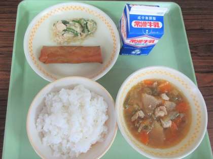 今日のメニューは、ご飯、牛乳、春巻き、棒々鶏サラダ、ピリ辛汁でした。