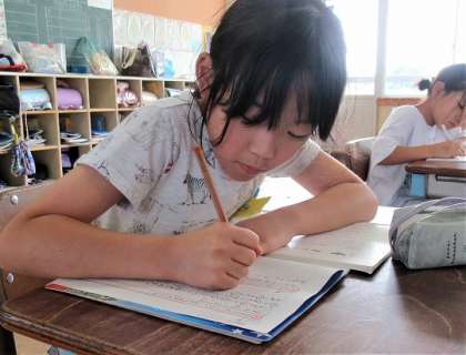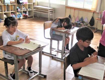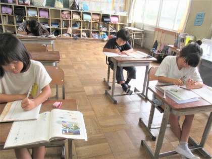 皆で考えて黒板に掲示した夏を感じるものを参考にして、文章を書いていました。