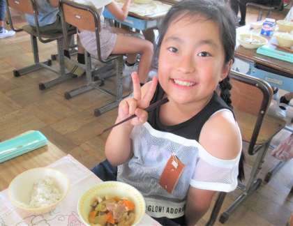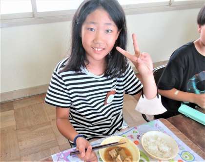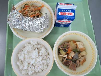 今日のメニューは、麦ご飯、牛乳、サバの銀紙焼き、切り干し大根の和え物、豚肉と冬瓜の煮物でした。